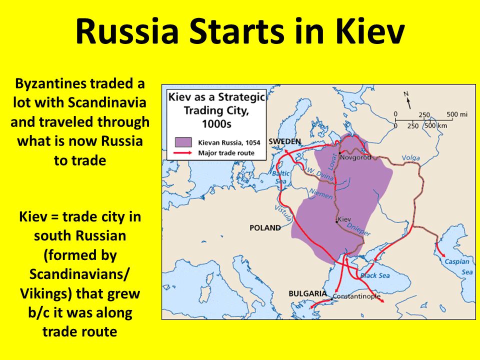The Scandinavian warrior-merchants in Russia were responsible for rapid urban growth in the country during the 900's A.D. The Rús turned Novgorod, a minor Slavic settlement on the island of Gorodische in Lake Ilmen, close to where the Volkhov river empties into it, into a major fortified market center in the 800's A.D. They moved the whole settlement to a larger fortified site called "New Fortress" or "Novgorod" in Russian a few miles to the north in the 900's A.D. Early Kievan Rús had wider ranging connections with the rest of Europe than any succeeding Russian state would enjoy before the 1700's A.D. (19) The Germanic Vikings in Russia within a few generations learnt the Slavic Russian, Ukrainian, and Belarusian languages or dialects, and there are only six or seven Scandinavian loan words in the Russian language today. (20) The West Slavs or Wends, who lived on the southern shores of the Baltic Sea, along with the Baltic Prussians, Lithuanians, Latvians and Finnish Estonians who lived on the south eastern and eastern shores of the Baltic Sea, were a warlike people, and although the Danish and Swedish Vikings occasionally managed to take control of a trading town on the coast, such as the unidentified Reric in the early 800's A.D., they made no headway inland. There was a degree of cultural interchange between the Scandinavians and West Slavs. The Slavs taught bridge-building techniques, and the Scandinavians taught shipbuilding. In the 1000's A.D., the West Slavs launched piratical hit and run raids in Viking style warships on Swedish and Danish coastal and riverine towns. (21) By the early 800's A.D. the Rús were navigating the Volga river and the Lovat-Dnieper river systems and had direct trading contacts with the Muslim, Arab Abbasid Calipate of Baghdad and the Byzantine Eastern Orthodox Empire far to the south. (22) In 907 A.D. Prince Oleg of Kiev launched an unsuccessfull attack against the strongly fortified Byzantine capital of Constantinople with a large fleet of Rús and Slav allies. (23) Kievan Rús reached the zenith of its power during the reign of Yaroslav the Wise (1019-1054 A.D.), by which time the Rús had become thoroughly Slavic in character. (24) Russian became the language of the Russian Eastern Orthodox Church after the rulers of Kievan Rús converted to the Byzantine branch of Christianity in 988 A.D., under the rule of Prince Vladimir of Kiev. (25) "Originally the Slavs during the early Middle Ages lived in clans which worshipped their ancestors, consisting of large familial communities. Several of these familial communities made up larger social units led by elders. These again made up the tribe with its military organization (the century as the basic unit of the levy, then the millenium) and its common religious cult. The leaders of the familial communities gradually developed into an aristocratic upper class. The particularism or strong independence of the tribes prevented the establishment of any great-power status for the Slavs." (26) "Historical sources speak of names and images of gods and godesses, of the temples of the West Slavs (the temple of Arkona on the island of Rügen, the shrine of the god Triglaw at Stettin and that of Svaricic at Rethra), of tree cults and oracles. The use of amulets and symbols indicates contacts with Iranian and Turkic tribes. The East Slavs knew the god of thunder and lightning, Perun. The supreme deity of the ancient pagan Slavs was Svarog, an early god of the heavens and thunder. The Slavs of the Havel area worshipped Dazbag (god of the sun) and Jarovit (god of spring). Within the familial communities the fertility gods Rod and Rozanicy were worshiped. All of the Slavic tribes worshiped nature." (27) "The Slavs occupied themselves with farming, hunting, fishing, the raising of domestic animals and bee-culture in the extended areas of their settlement. There were also - predominantly living in the towns - artisans or specialists such as carpenters, weavers, potters, tanners and furriers. Active trading developed along the rivers. Raw materials such as honey, amber, wax and furs, along with slaves, were exchanged for textiles, weapons, utensils, jewellery, gold and silver. The Jews, Germanic peoples, Greeks, Khazars and Arabs at first monopolized trade; the Slavs themselves did so later. The trading centers of the East Slavs became fortified towns." (28)